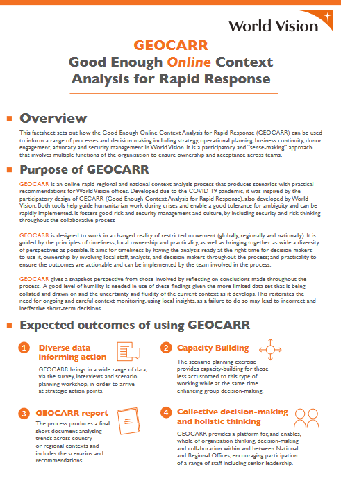 This factsheet sets out how the Good Enough Online Context Analysis for Rapid Response (GEOCARR) can be used to inform a range of processes and decision making, including: strategy, operational planning, business continuity, donor engagement, advocacy and security management in World Vision.